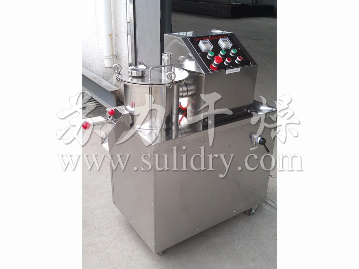 粉體物料與粘合劑在圓筒形容器中由底部混合漿充分混合成濕潤軟材,然后由側置的高速粉碎槳切割成均勻的濕顆粒。